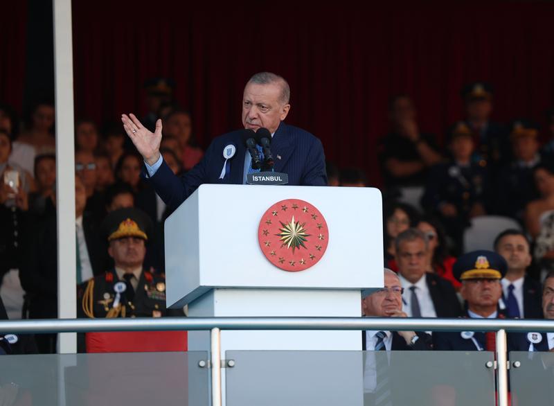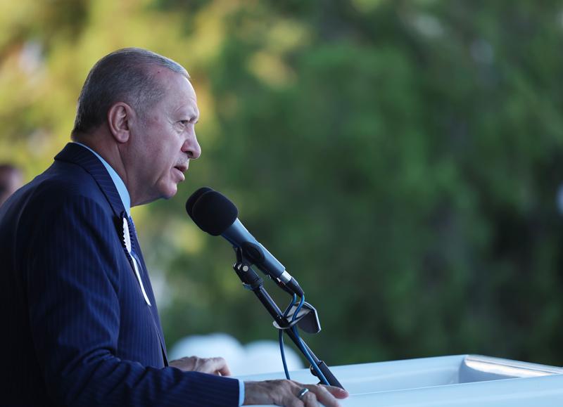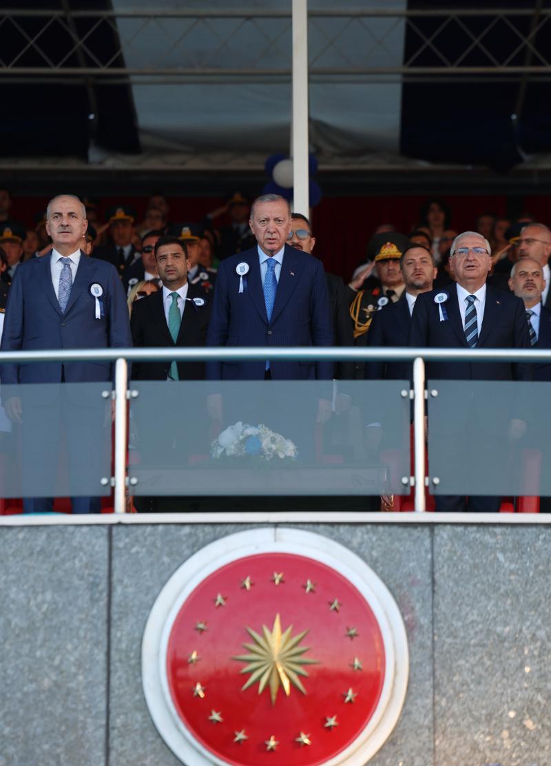 30 Ağustos Zafer Bayramı'nı Cumhurbaşkanlığı Külliyesi'nde kutladıklarına vurgu yapan Erdoğan, "Milletin evinde dualarla, marşlarla yine büyük bir coşkuyla kutladık. Dün Kara Harp Okulumuzun hem mezuniyet sevincini paylaştık hem de inşası tamamlanan yaklaşık 1500 kişi kapasiteli camimizi ibadete açtık. Bugün önce Deniz Harp Okulumuzda bahriyelilerimize diplomalarını takdim ettik, şimdi de sizlerin mezuniyet heyecanına ortak oluyoruz." diye konuştu.