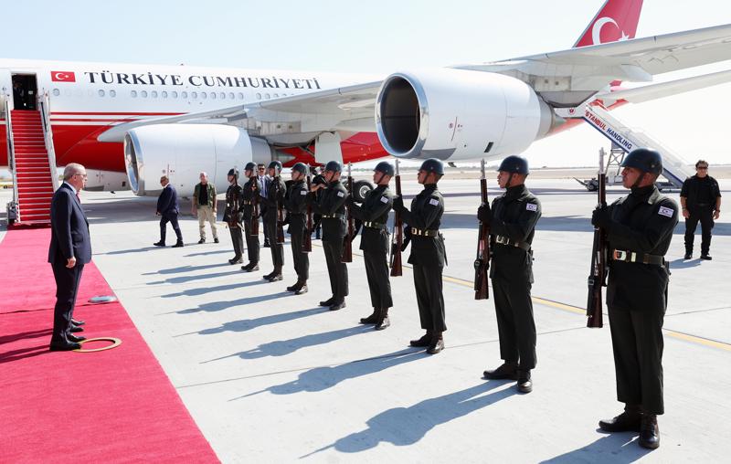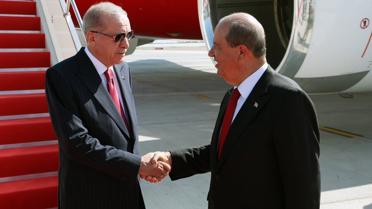 Erdoğan, Ercan Havalimanı'nda, KKTC Cumhurbaşkanı Ersin Tatar tarafından resmi törenle karşılandı.