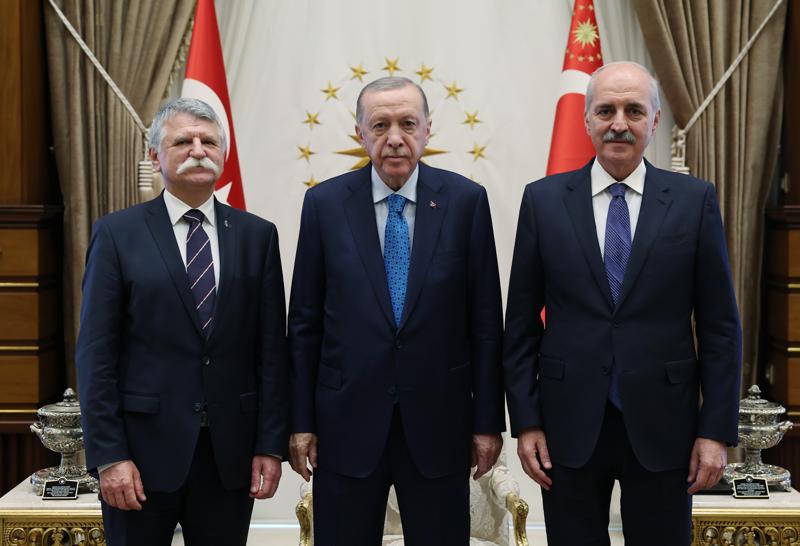 Cumhurbaşkanı Recep Tayyip Erdoğan, Macaristan Ulusal Meclis Başkanı Laszlo Köver'i, Cumhurbaşkanlığı Külliyesi'nde kabul etti.<img class='rich-text-photo' src='https://imgs.stargazete.com/imgsdisk/2024/10/17/35937205.jpg'/><img class='rich-text-photo' src='https://imgs.stargazete.com/imgsdisk/2024/10/17/35937204.jpg'/>