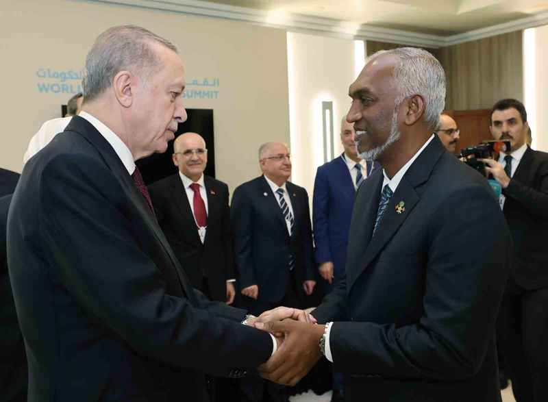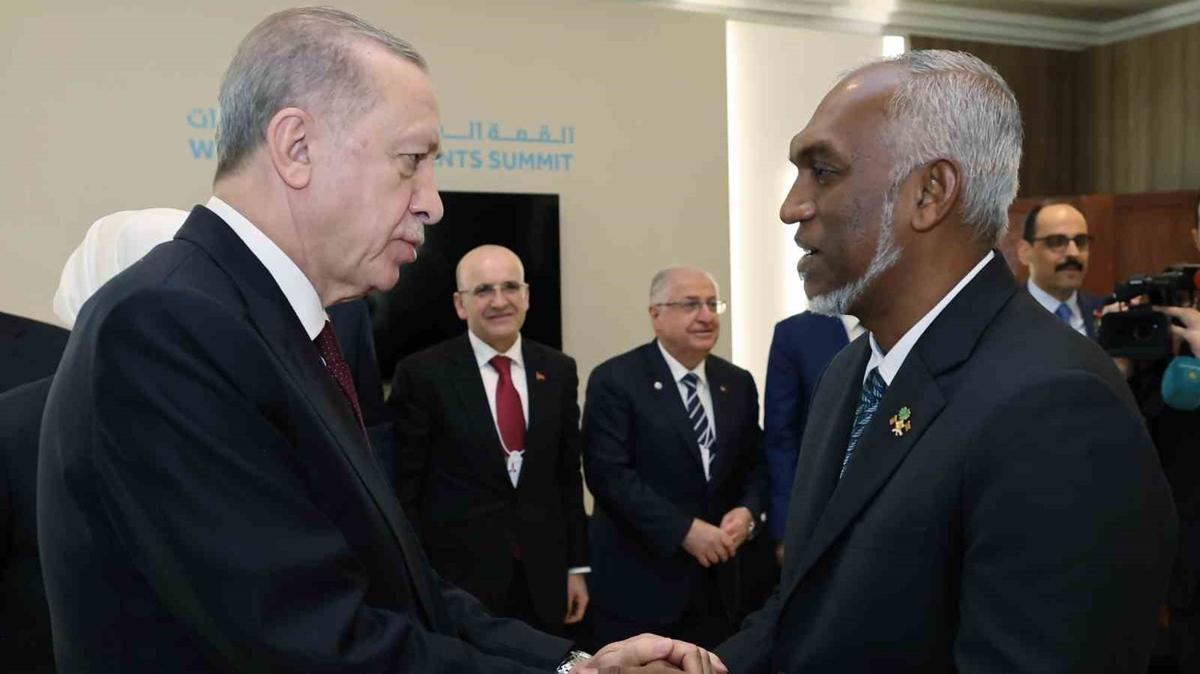 Cumhurbaşkanı Recep Tayyip Erdoğan, Dünya Hükümetler Zirvesi çerçevesinde bulunduğu BAE'nin Dubai kentinde ikili temaslarını sürdürüyor. Cumhurbaşkanı Erdoğan, zirvedeki hitabının ardından Maldivler Devlet Başkanı Muhammed Muizzu ile ayaküstü görüşme gerçekleştirdi.