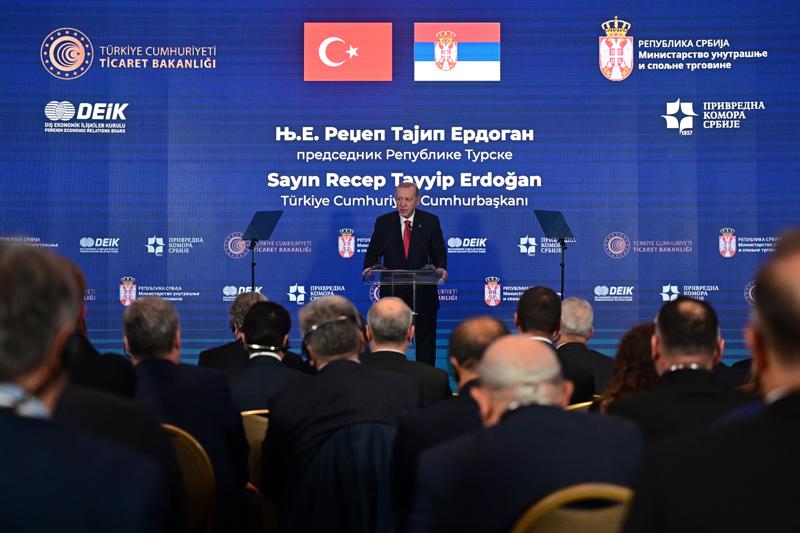 Sırbistan'daki bir otelde düzenlenen Türkiye-Sırbistan İş Forumu'nda bir konuşma yapan Erdoğan, Sırbistan Cumhurbaşkanı Aleksandar Vucic'e teşekkür ederek, bakanların, iş dünyasının farklı sektörlerinden temsilcilerin yer aldığı geniş bir heyetle gerçekleştirdikleri bu ziyaretin Sırbistan'la işbirliğine verdikleri önemin açık bir göstergesi olduğunu dile getirdi.