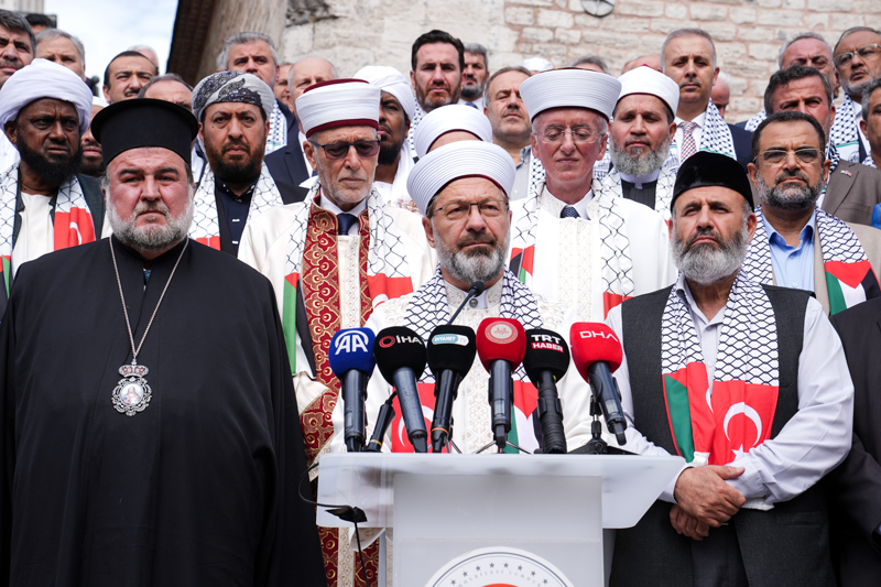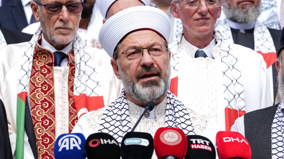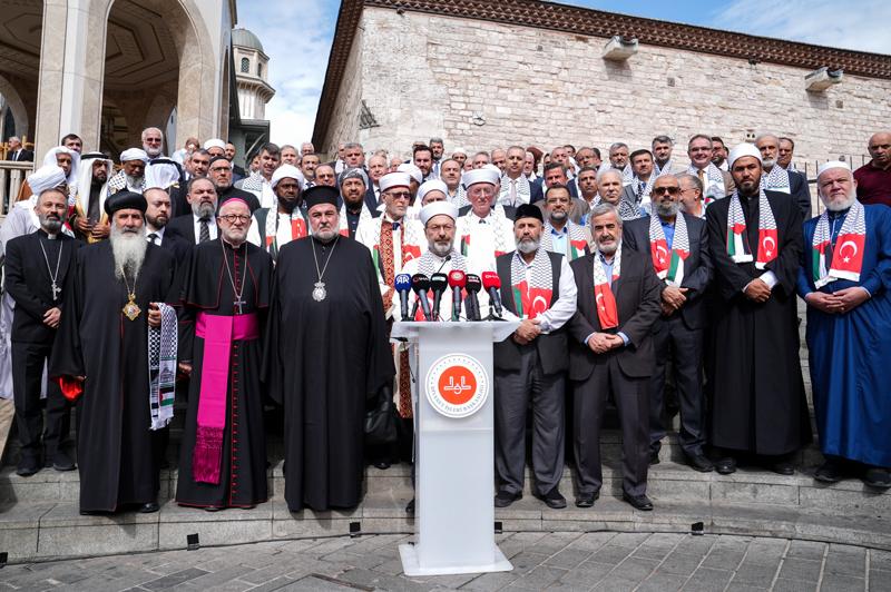 Erbaş, Taksim Camisi önünde İsrail'in Gazze'ye yönelik işgal ve soykırımına karşı Müslüman alimler ve farklı inançlara mensup din adamları ile "Barışa çağrı" başlıklı ortak basın açıklaması yaptı.