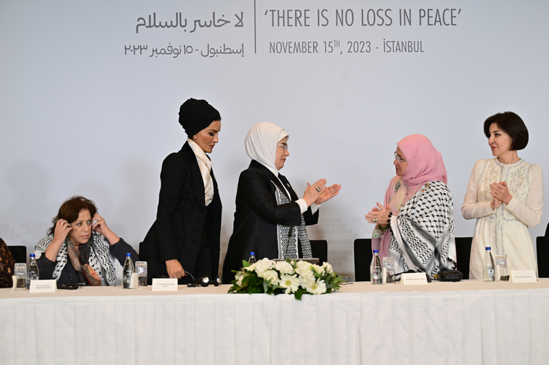 Katar Emiri Şeyh Temim bin Hamed Al Sani'nin annesi Şeyha Moza binti Nasır, Senegal Cumhurbaşkanı Macky Sall'ın eşi Marieme Faye Sall, Malezya Kraliçesi Tunku Azizah Aminah Maimunah Iskandariah, Özbekistan Cumhurbaşkanı Şevket Mirziyoyev'in eşi Ziroat Mirziyoyeva, Kongo Cumhuriyeti Cumhurbaşkanı Denis Sassou N'Guesso'nun eşi Antoinette Sassou N'Guesso, Bangladeş Cumhurbaşkanı Muhammed Şahabuddin Çuppu'un eşi Rebeka Sultana, Bosna Hersek Devlet Başkanlığı Konseyinin Hırvat üyesi Zeljko Komsic'in eşi Sabina Komsic, Lübnan Başbakanı Necip Mikati'nin eşi May Mikati, İskoçya Bölgesel Başbakanı Hamza Yusuf'un eşi Nadia El-Nakla, Libya Başbakanı Abdulhamid Dibeybe'nın eşi Amina Ali Muhammed El-Shavush El-Dilawi, Filistin Özel Temsilcisi Ferial Kamel Abdalrahman Salem, Birleşik Arap Emirlikleri Dışişleri Bakanı Abdullah bin Zayid en-Nehyan'ın eşi Sheikha Alyazia bint Saif Al Nahyan, Mısır Planlama ve Ekonomik Kalkınma Bakanı Dr. Hala Elsaid ve Türkmenistanlı diplomat Chinar Rustamova da basın toplantısında yer aldı.