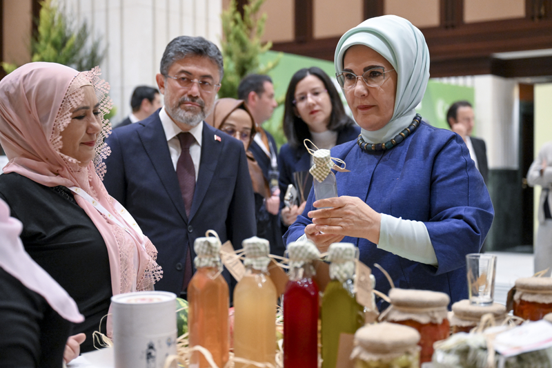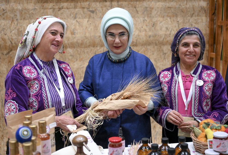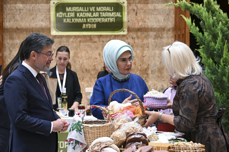 Emine Erdoğan, Bakan Yumaklı ile 15 Ekim Dünya Kadın Çiftçiler Günü dolayısıyla Türkiye'nin çeşitli bölgelerinden 18 kadın kooperatifince fuaye alanında açılan stantları gezdi.