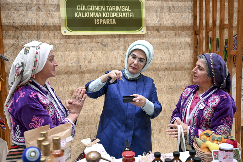 Fuaye alanında kadın çiftçilerin, pamuk dallarından yapılan buketle karşılanan Emine Erdoğan, daha sonra stantlarda kadın çiftçilerin AB Tescilli Coğrafi İşaretli ürünler ile Ankara Sofu kumaşından ürünler başta olmak üzere tarhana, erişte, marmelat, reçel, sabun, kolonya, gül yağı, dokuma ve çeşitli el sanatları ürünlerini tek tek inceledi.