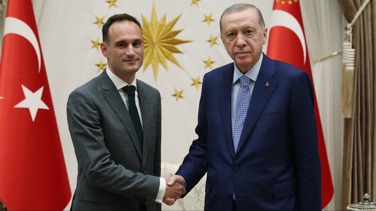 Cumhurbaşkanlığı Külliyesi'ndeki kabulde, Rencelj, Erdoğan'a güven mektubu sundu.