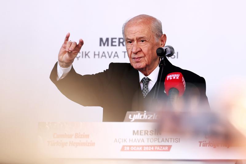 Bahçeli, Mersin'in Türk ve Türkiye Yüzyılı'nın parlayan yıldızı haline geleceğini belirterek, "Bu hedeflere beraber yürüyecek miyiz? Mersin'i prangalarından kurtaracak mıyız? Mersin'in geleceği için el ele, omuz omuza, gönül gönüle verecek miyiz? Demlenmiş, gemlenmiş, yemlenmiş, rehin altına alınmış CHP'den kurtuluş için harekete geçecek miyiz? Seçer'i kızağa çekip Soydan'ı seçecek miyiz? Önümüzdeki 5 yıl için sizlerden olur ve onay istiyoruz. Herkes tersine giderken biz Mersin'i daha da büyütmek, daha da geliştirmek arzusundayız. Bu nedenle Cumhur İttifakı'nın birbirinden değerli belediye başkan adaylarıyla Mersin'in hizmetine talibiz." diye konuştu.