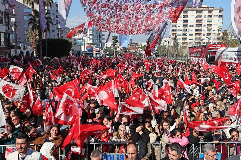 MHP Genel Başkanı Devlet Bahçeli, Mersin Millet Bahçesi'nin yanındaki alanda "Cumhur Bizim, Türkiye Hepimizin" sloganıyla düzenlenen açık hava toplantısında, Mahalli İdareler Genel Seçimlerine 63 gün kala ilk açık hava toplantılarını Mersin'de yapmanın bahtiyarlığını yaşadıklarını söyledi.