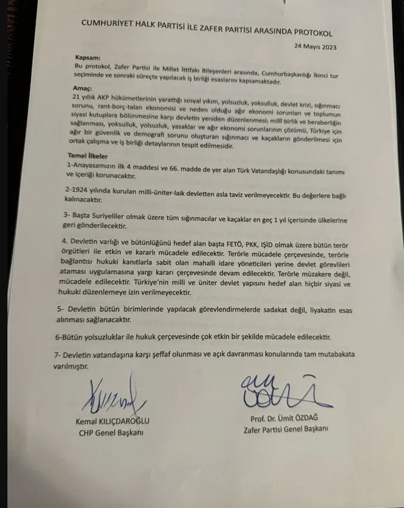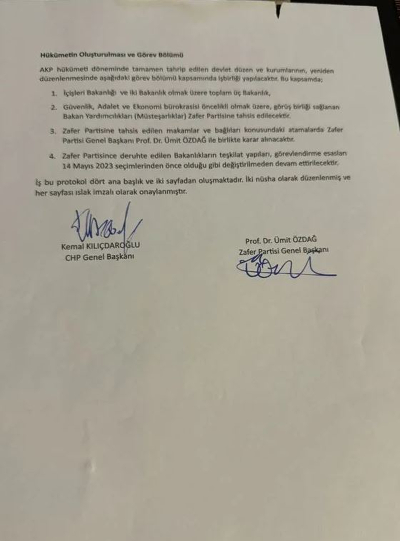 Protokolde, Kılıçdaroğlu'nun seçimi kazanması halinde Ümit Özdağ ve Zafer Partisi'ne İçişleri Bakanlığı başta olmak üzere toplam üç bakanlık sözünün verildiği görüldü.