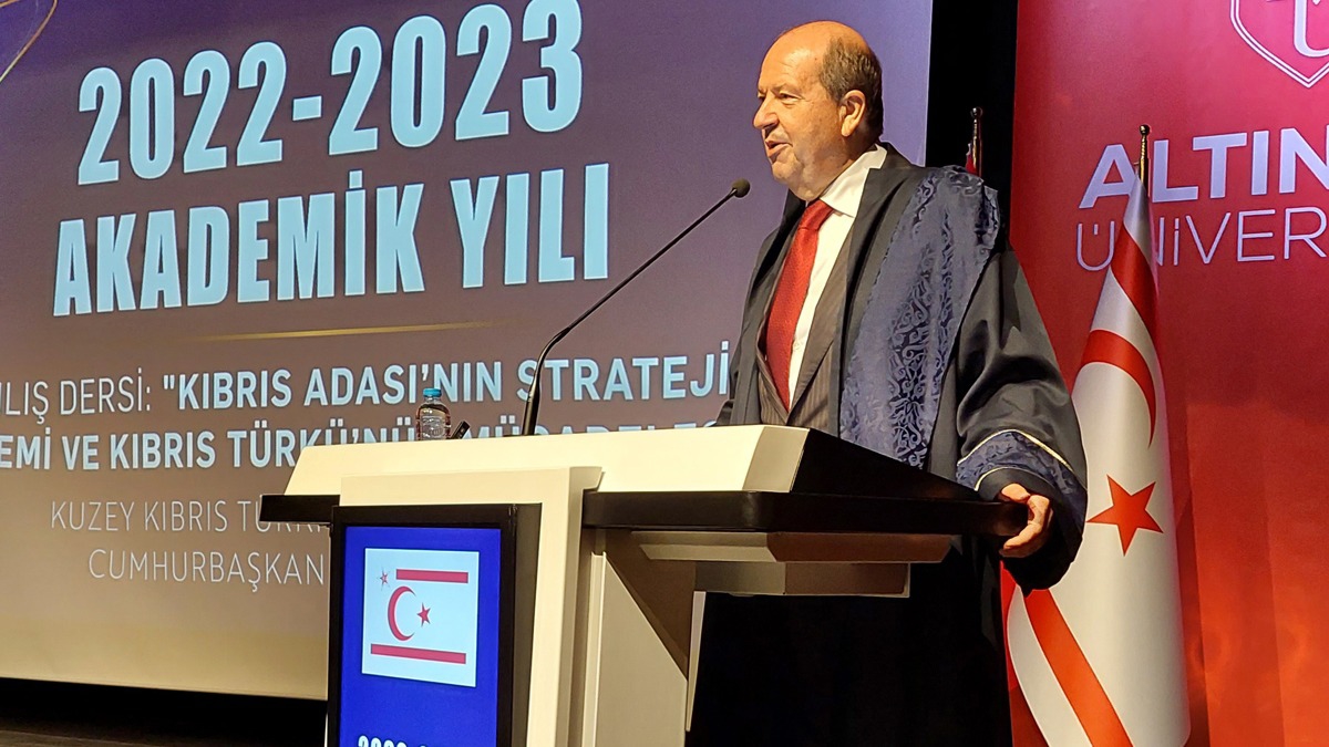 Akademik açılışın "ilk dersi" ise Cumhurbaşkanı Tatar tarafından verildi. Kıbrıs tarihi ile ilgili önemli bilgilendirmelerde bulunan Tatar ayrıca gündeme dair de değerlendirmelerde bulundu. Tatar yaptığı konuşmada Kıbrıs üzerinde bir oyun oynandığını ve buna izin vermeyeceklerini söyleyerek sözlerine şöyle devam etti: