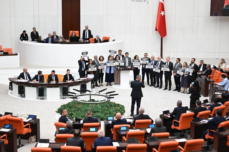 Kürsünün önünde pankart açan DEM Partililer yorulunca da yere oturdular. CHP'lilerin yanlarına gidip sohbet edip destek verdiği görüldü.