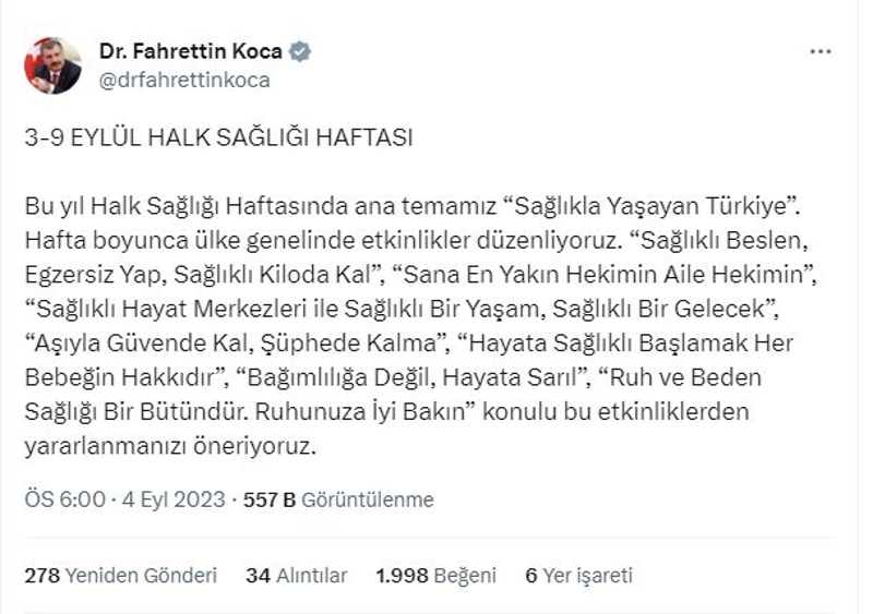 Bakan Koca, 3-9 Eylül Halk Sağlığı Haftası'na yönelik sosyal medyadan yaptığı paylaşımda, şu ifadelere yer verdi: