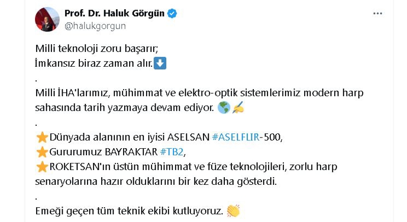 Savunma Sanayii Başkanı Haluk Görgün, test atışlarına ilişkin sosyal medya hesabından yaptığı açıklamada, "Milli teknoloji zoru başarır; imkansız biraz zaman alır. Milli İHA'larımız, mühimmat ve elektro-optik sistemlerimiz modern harp sahasında tarih yazmaya devam ediyor. Dünyada alanının en iyisi ASELSAN ASELFLIR-500, gururumuz Bayraktar TB2, ROKETSAN'ın üstün mühimmat ve füze teknolojileri, zorlu harp senaryolarına hazır olduklarını bir kez daha gösterdi. Emeği geçen tüm teknik ekibi kutluyoruz" dedi.