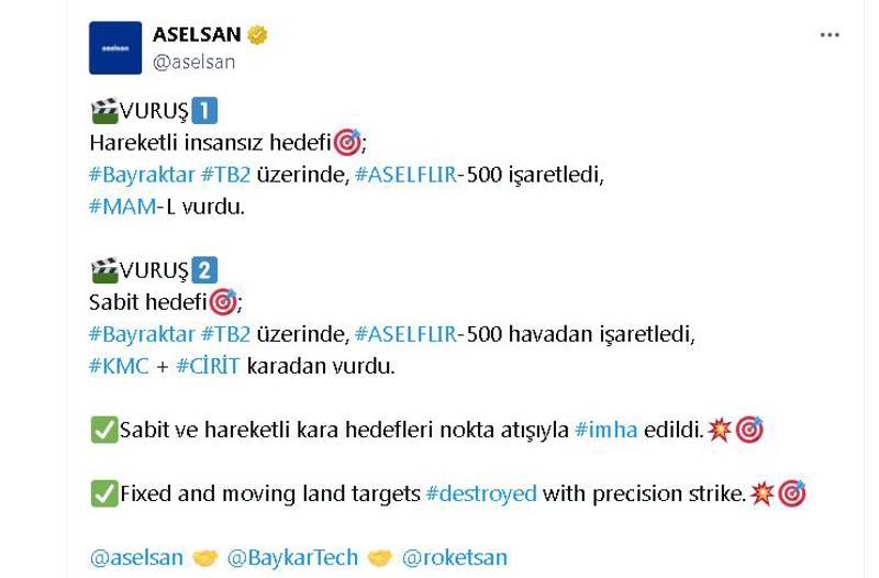 Askeri Elektronik Sanayi (ASELSAN), Roket Sanayii ve Ticaret A.Ş. ile BAYKAR firmaları tarafından üretilen yerli insansız hava aracı (İHA) Bayraktar TB2, yüksek çözünürlüklü kızıl ötesi kamera ASELFLIR-500 ve yerli füze sistemleri ile yerli savunma sanayi ürünleriyle ekip tatbikatı yapıldı.