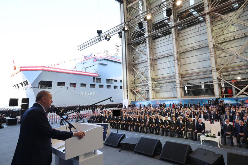 Erdoğan, MİLGEM Projesi'nin beşinci gemisi TCG İstanbul'un Türkiye'nin yerli imkanlarla ürettiği ilk milli fırkateyn olduğunu belirterek, "Bu gemimize farklı radar, yakın hava savunma ve elektronik harp sistemlerimizi kendi imkanlarımızla geliştirerek entegre ettik. TCG İstanbul'a entegre edilen sistemlerden biri de Milli Dikey Atım Lançer Sistemi'dir. Bugün hizmete verdiğimiz lojistik destek gemimiz TCG Üsteğmen Arif Ekmekçi, muharip unsurların akaryakıt, tatlı su ve yiyecek ihtiyaçlarını temin edecektir." ifadelerini kullandı.