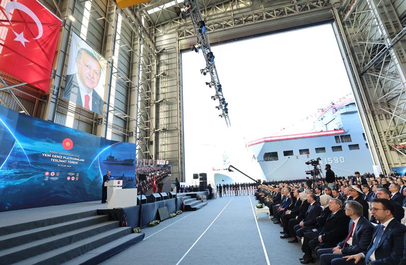 Milli Savunma Bakanı Yaşar Güler, Genelkurmay Başkanı Orgeneral Metin Gürak, Cumhurbaşkanlığı Savunma Sanayii Başkanı Haluk Görgün, Deniz Kuvvetleri Komutanı Oramiral Ercüment Tatlıoğlu'nun da konuşma yaptığı törende, Cumhurbaşkanı Erdoğan, bahriyelileri selamladı.