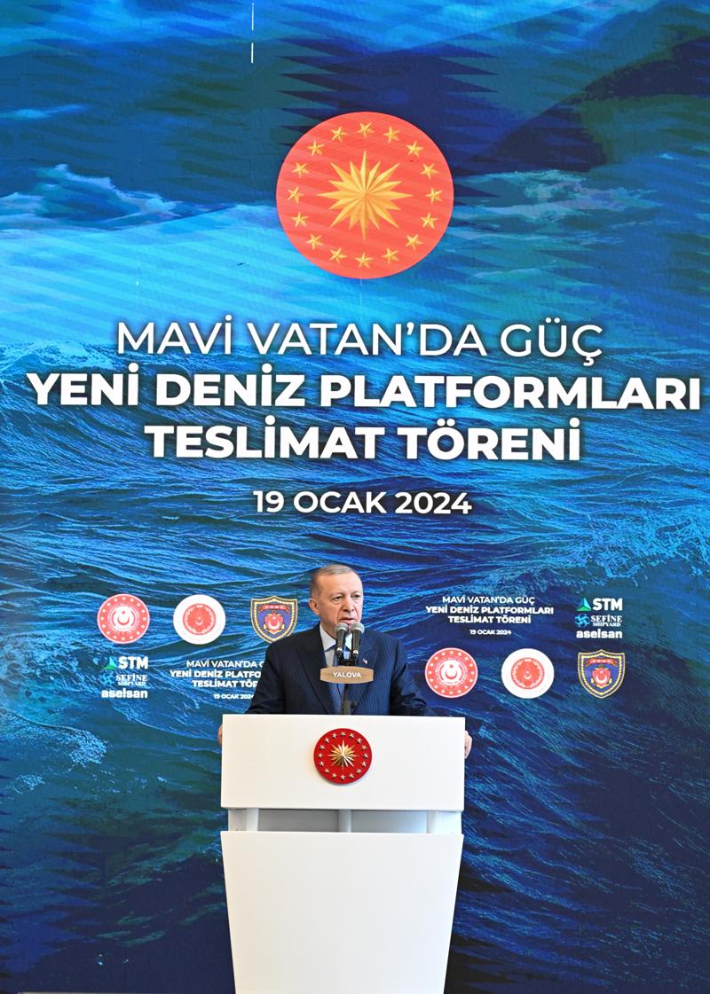 Cumhurbaşkanı Erdoğan, Yalova'daki Sefine Tersanesi'nde düzenlenen Mavi Vatan'da Güç: Yeni Deniz Platformları Teslimat Töreni'nde yaptığı konuşmada, katılımcıları selamlayarak, donanmanın caydırıcılığını daha da artıracak projelerin teslim töreni vesilesiyle bir arada olduklarını söyledi.