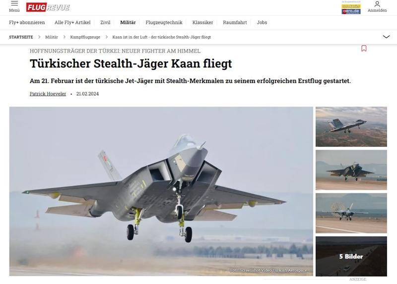 Havacılık sitesi Flugrevue'deki haberde de KAAN'ın Türkiye'nin umut ışığı ve gökyüzündeki yeni savaş uçağı olduğu belirtildi.