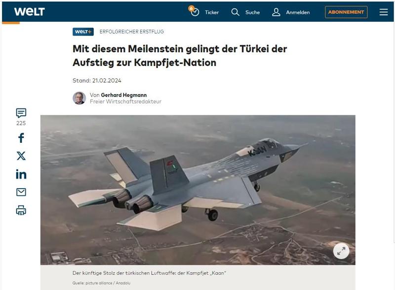 Alman Welt gazetesinin "Bu dönüm noktası, Türkiye'nin bir savaş uçağı ülkesi olarak yükselişine işaret ediyor" başlıklı haberinde KAAN'ın ilk uçuşunu başarıyla tamamladığı ve Türkiye Cumhurbaşkanı Recep Tayip Erdoğan için bunun ABD'ye karşı kazanılmış bir zafer anlamına geldiği ifade edildi.