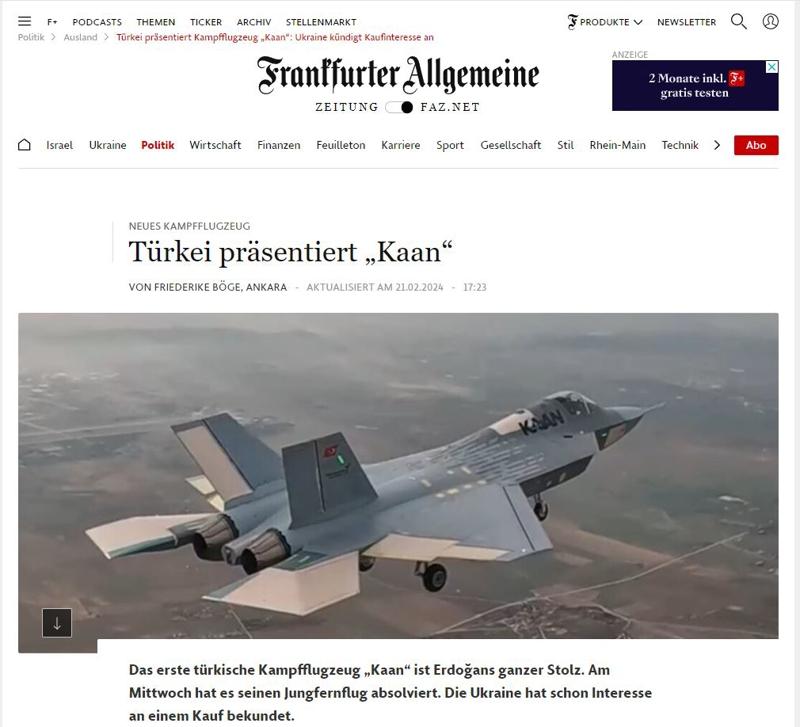 Frankfurter Allgemeine gazetesi de "Türkiye KAAN'ı sundu" başlıklı haberinde Türk yapımı ilk savaş uçağının ilk uçuşunu başarıyla tamamladığı ifade edildi.