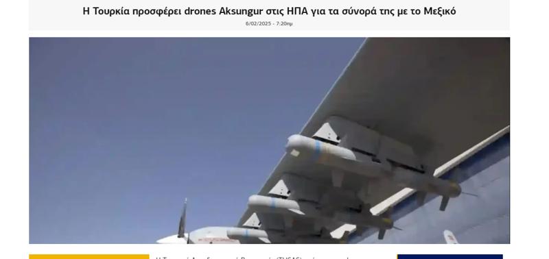 ABD'YE AKSUNGUR İHA TEKLİFİYunan basını, TUSAŞ'ın Trump yönetiminin yasadışı göçmenleri sınır dışı etme ve yeni göçmenlerin girişini engelleme çabaları kapsamında, Meksika sınırında keşif operasyonlarında kullanılması amacıyla uzun süre havada kalabilen Aksungur İHA'sını ABD'ye teklif ettiğini yazdı.