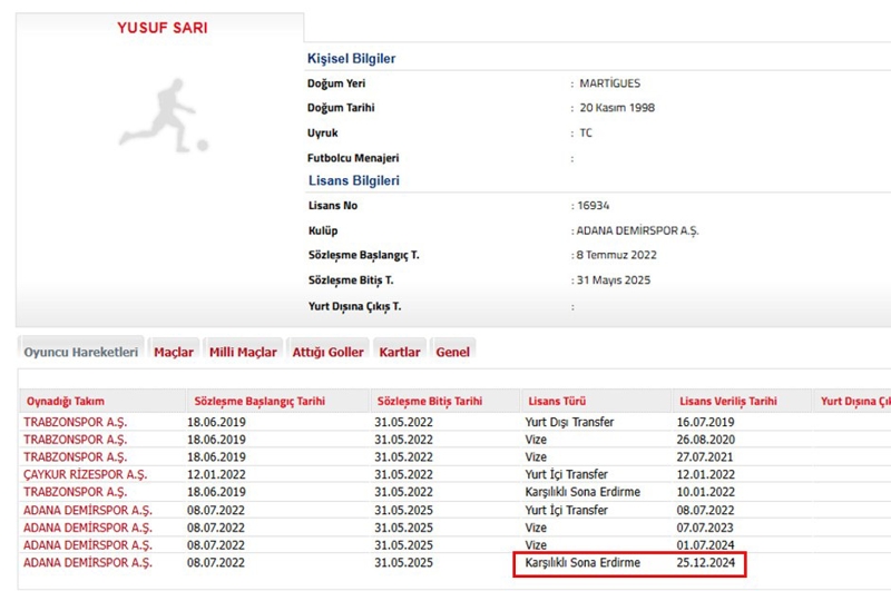 Trendyol Süper Lig'in son sırasında yer alan Adana Demirspor, Yusuf Sarı'nın sözleşmesinin feshedildiğini Türkiye Futbol Federasyonu'na (TFF) bildirdi. 26 yaşındaki futbolcunun sözleşmesi sezon sonunda bitecekti.