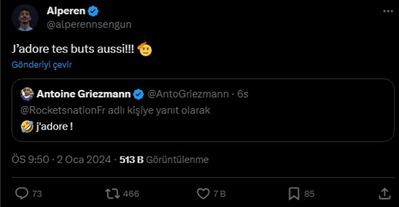 Griezmann'a yanıt veren Alperen Şengün ise, "Ben de senin gollerini beğeniyorum!" ifadelerini kullandı.