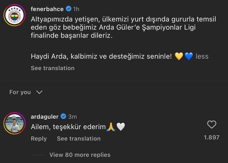 Fenerbahçe, Arda Güler için yaptığı paylaşımda, "Altyapımızda yetişen, ülkemizi yurt dışında gururla temsil eden göz bebeğimiz Arda Güler'e Şampiyonlar Ligi finalinde başarılar dileriz. Haydi Arda, kalbimiz ve desteğimiz seninle!" ifadelerini kullanmıştı.