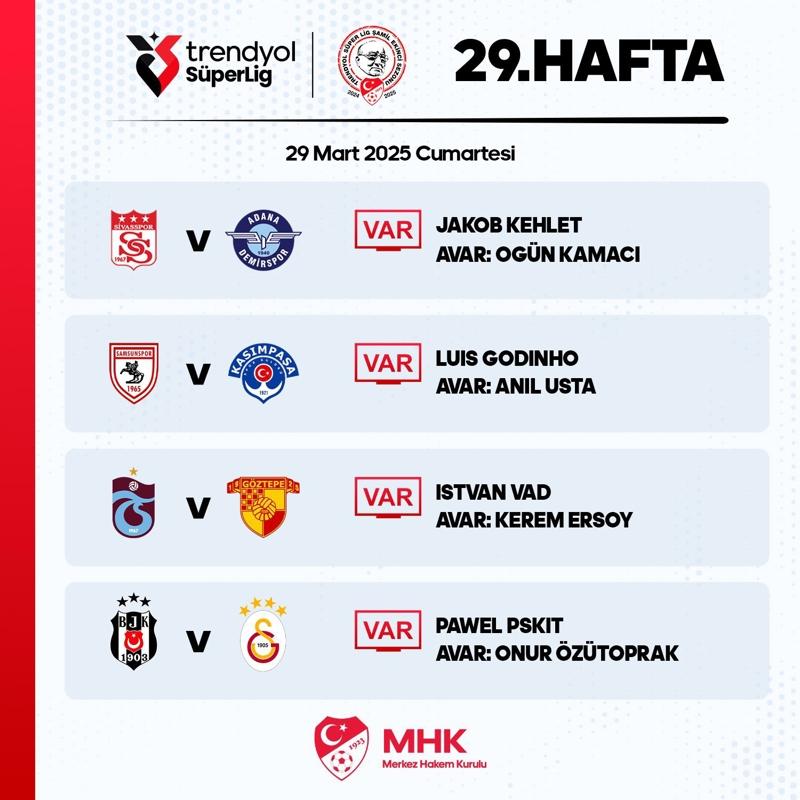 Süper Lig'de bugün oynanacak maçların VAR hakemleri açıklandı.MHK'dan yapılan duyuruya göre; Beşiktaş-Galatasaray derbisinin VAR koltuğunda Polonyalı isim Pawel Pskit görev yapacak.<b>İşte günün diğer maçlarının VAR hakemleri:</b><img class='rich-text-photo' src='https://imgs.stargazete.com/imgsdisk/2025/03/29/gnmlyqzxaaaf7n8-29032025ce056095.jpg'/>