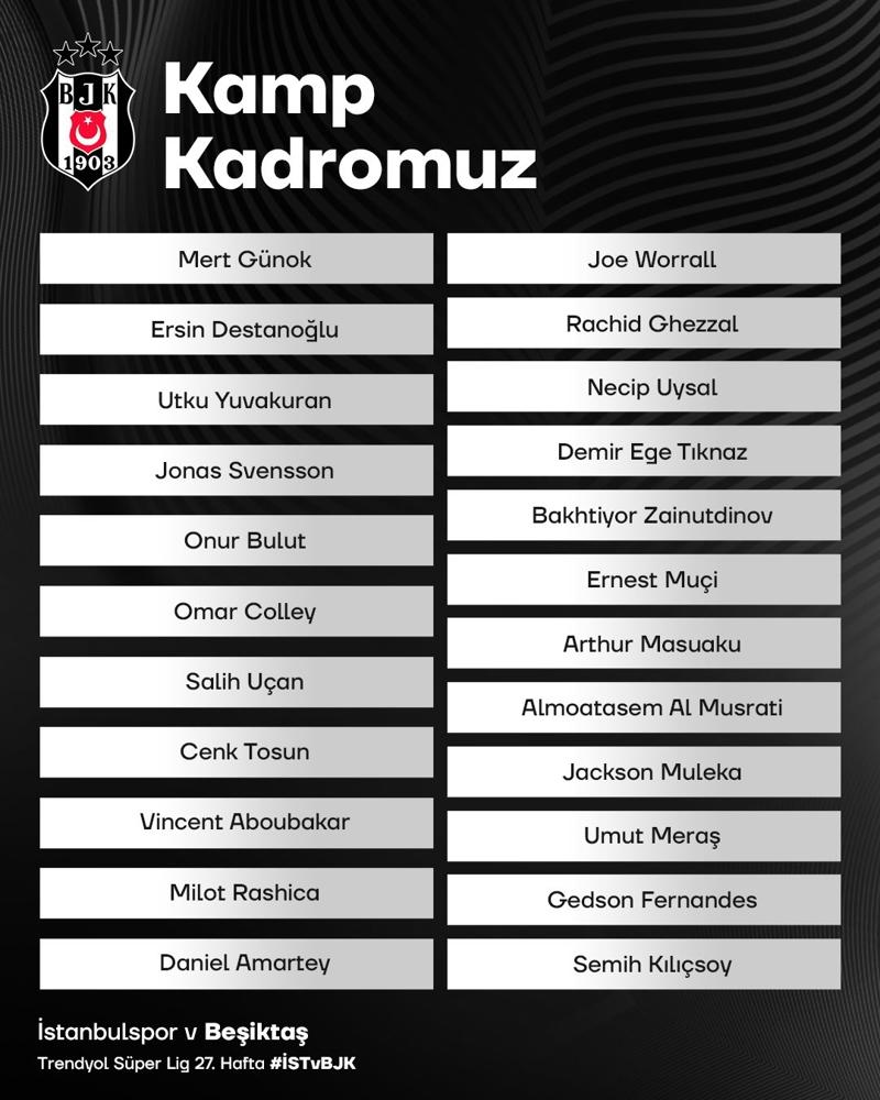 Beşiktaş, Süper Lig'de İstanbulspor ile oynayacağı maçın kamp kadrosunu açıkladı.Siyah-beyazlıların kamp kadrosunda Tayyip Talha Sanuç, Emrecan Terzi ve Ante Rebic yer almadı.<b>Beşiktaş'ın İstanbulspor maçı kamp kadrosu şu şekilde:</b><img class='rich-text-photo' src='https://imgs.stargazete.com/imgsdisk/2024/02/24/ghhyghkxyaambze-24022024537c8e14.jpg'/>