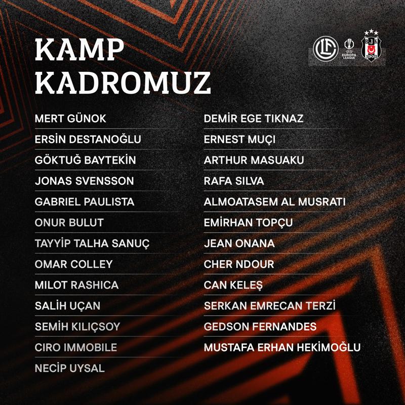 UEFA Avrupa Ligi play-off turu ilk maçında Lugano ile deplasmanda karşılaşacak Beşiktaş, bu maçın kamp kadrosunu açıkladı.Beşiktaş'ta Jackson Muleka ve Vincent Aboubakar kamp kadrosunda yer almadı.<b>Beşiktaş'ın kadrosu şu şekilde:</b><img class='rich-text-photo' src='https://imgs.stargazete.com/imgsdisk/2024/08/21/gvgl6bxmaens6l-210820246d69cd58.jpg'/>