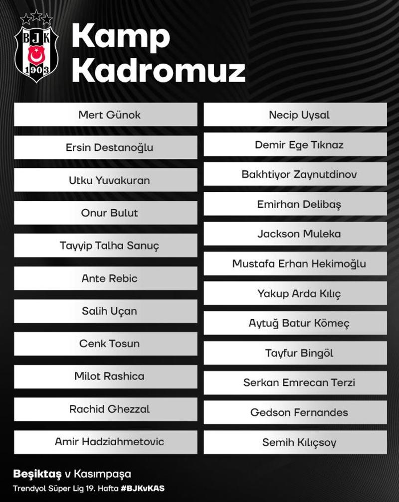 Beşiktaş, Süper Lig'in 19. haftasında oynayacağı Kasımpaşa maçı kadrosunu açıkladı.