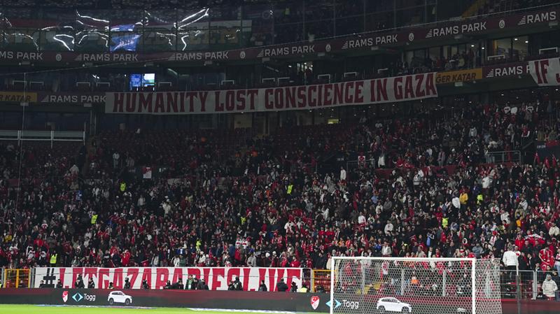 Soykırımcı İsrail'in Filistin'deki işgali ve Gazze ile Batı Şeria'daki saldırılarına tepki olarak RAMS Park tribünlerinde çok sayıda pankart yer aldı.