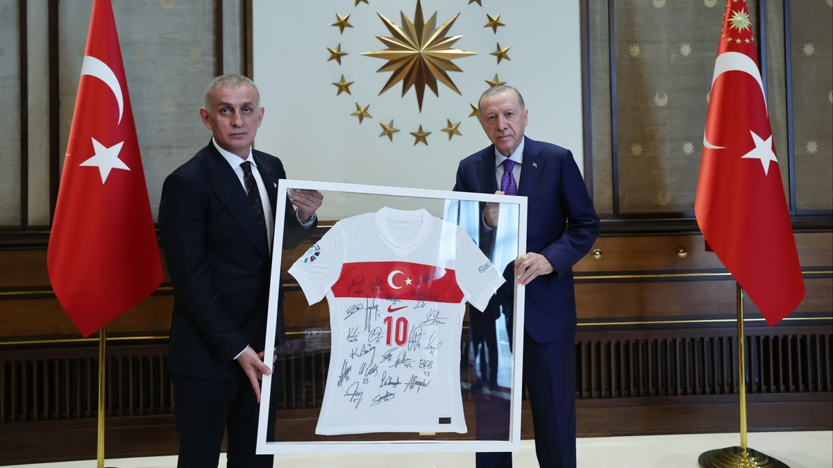 Kabulün sonunda TFF Başkanı Hacıosmanoğlu, Cumhurbaşkanı Recep Tayyip Erdoğan'a A Milli Futbol Takımı kaptanı Hakan Çalhanoğlu'nun 2024 Avrupa Futbol Şampiyonası'nda giydiği ve tüm takım tarafından imzalanmış birer A Millî Takım forması takdim etti.