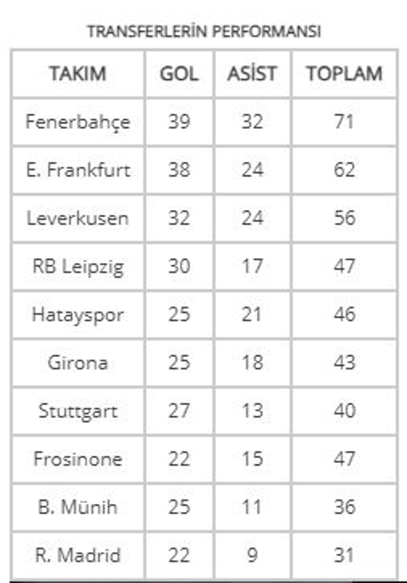 Majör ligler ve Süper Lig'in baz alındığı değerlendirmede Fenerbahçe, tüm kulvarlarda yeni oyuncularından bulduğu 71 gollük (39 gol-32 asist) katkıyla 116 takım arasında Avrupa'da ilk sırada yer aldı. Hem gol hem de asistte liderliği domine eden Kanarya'yı, 3 Alman ekibi Eintracht Frankfurt (62), Leverkusen (56) ve Leipzig (47) izledi. Listede Volkan Demirel'in ayağa kaldırdığı Hatayspor da 10 takım içinde kendine 5. sırada yer buldu.