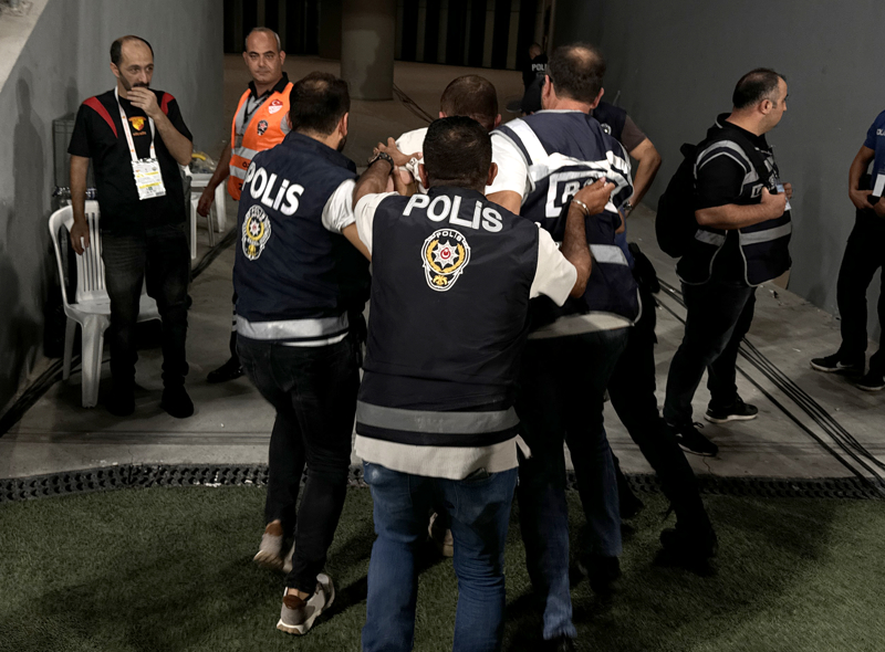 Bunun üzerine İzmir İl Emniyet Müdürlüğü Spor Güvenliği Şubesi ekipleri, Koç'u saha kenarında yürüdüğü sırada iterek düşüren Fatih Özkan'ı gözaltına aldı.