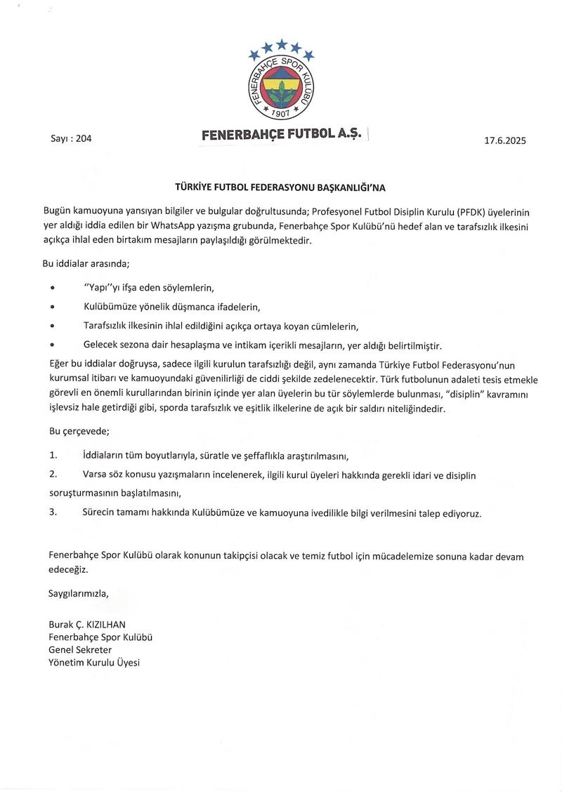 Fenerbahçe Spor Kulübü, Profesyonel Futbol Disiplin Kurulu (PFDK) üyelerine ait olduğu iddia edilen bazı yazışmaların kamuoyuna yansımasının ardından Türkiye Futbol Federasyonu'na resmi bir başvuruda bulundu.