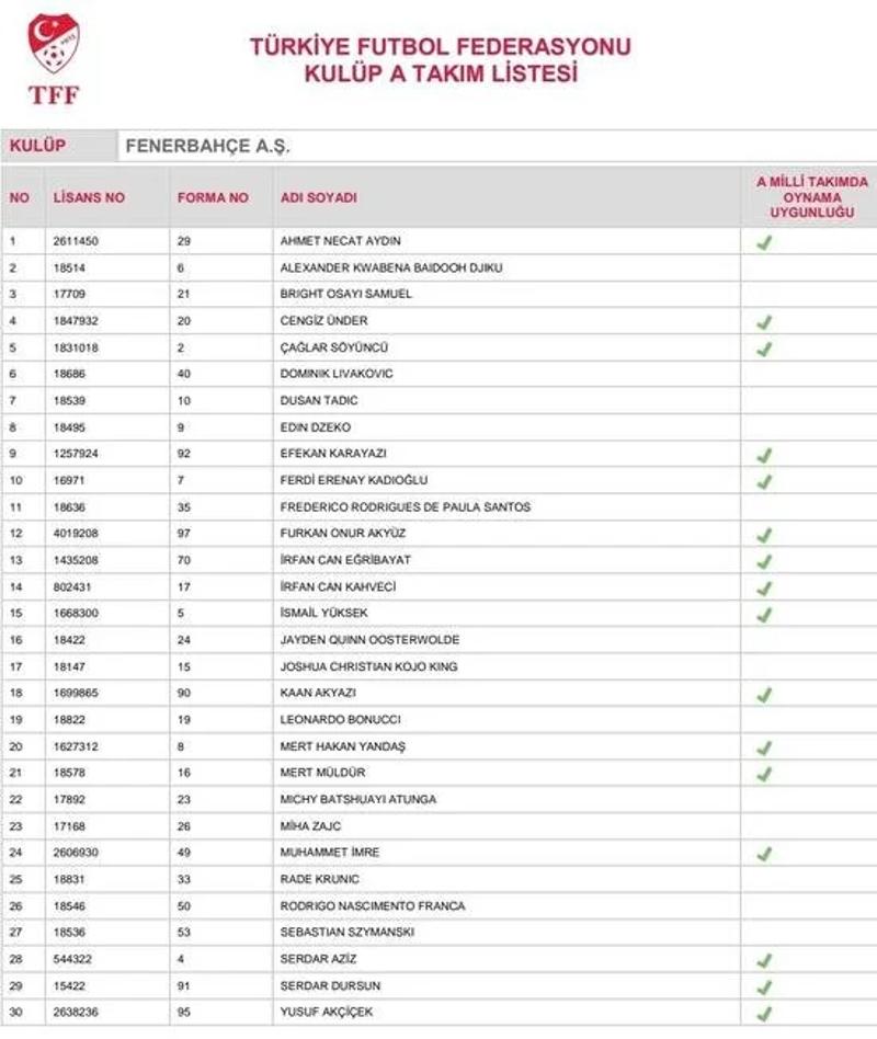 Fenerbahçe'nin 30 kişilik A takım listesinde şu futbolcular bulunuyor:
