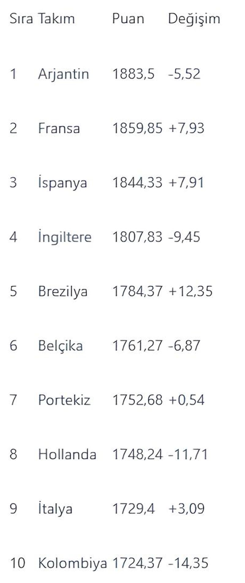 Listenin ilk 6 sırasındaki ekipler yerini korurken, Portekiz 7. sıraya, İtalya da 9. sıraya yükseldi. Hollanda ve Kolombiya ise birer basamak geriledi.