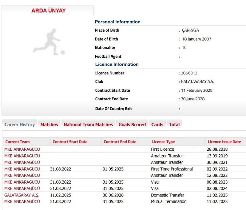 Galatasaray, MKE Ankaragücü'nden Arda Ünyay için TFF'ye lisans bildirimini yaptı.
