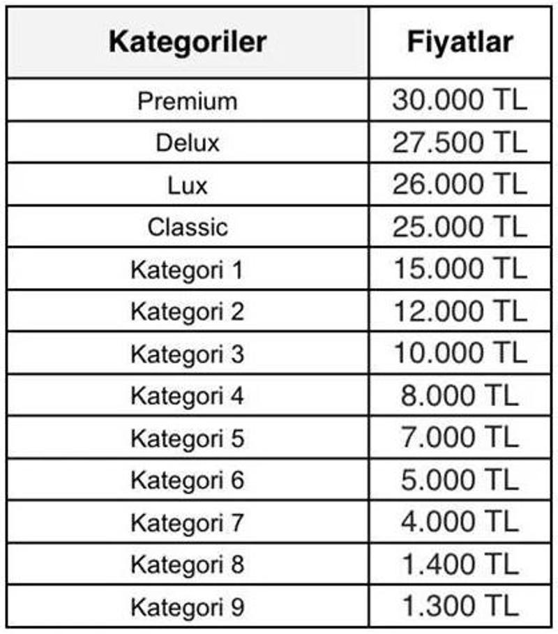 Kategorilere göre değişen bilet fiyatları şu şekilde;