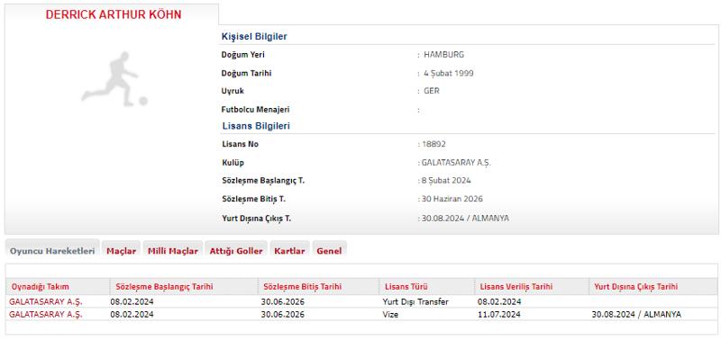 TFF'nin resmi internet sitesinde yer alan Futbol Bilgi Bankası bölümünde, Köhn'ün bugün itibariyle Almanya'ya transfer olduğu bilgisi yer aldı.
