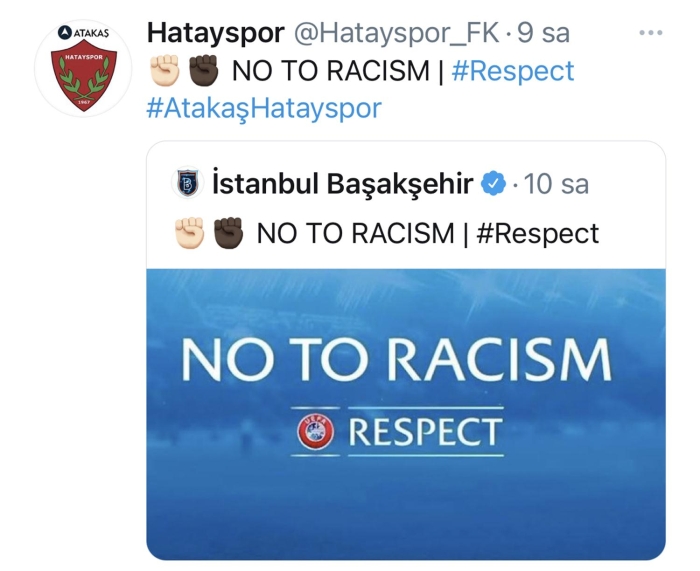 Öte yandan, Atakaş Hatayspor Kulübü resmi twitter hesabından, “NoToRacism” etiketi ile paylaşım yaptı.