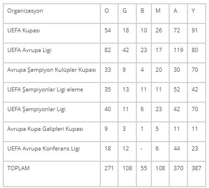 Fenerbahçe'nin Avrupa kupalarındaki performansı şöyle: