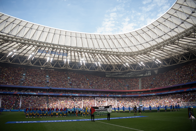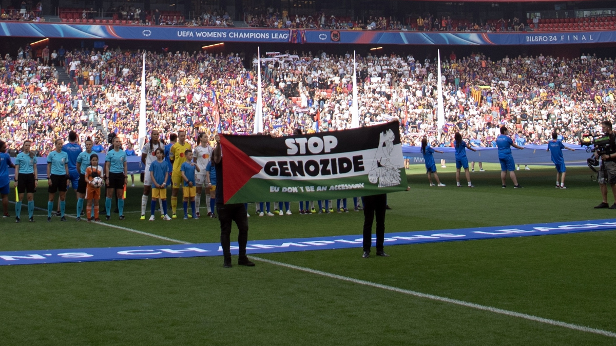 İspanya'nın Bilbao kentindeki San Mames Stadı'nda Barcelona ve Olimpik Lyon takımları arasında oynanan UEFA Kadınlar Şampiyonlar Ligi finalinde sahada "Soykırımı durdurun" yazılı pankart açıldı.