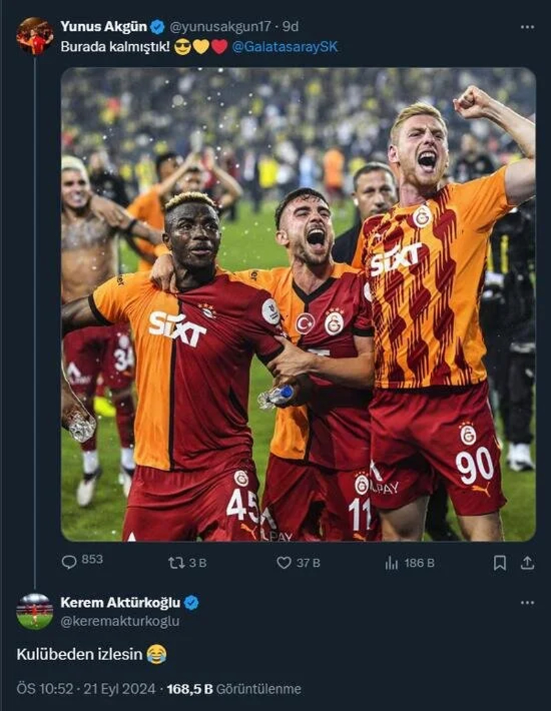 Geçen sezon Rams Park'ta oynanan maçın ardından Mert Hakan Yandaş ile tartışan Kerem Aktürkoğlu, maç sonunda Yunus Akgün'ün paylaşımına cevap verdi.