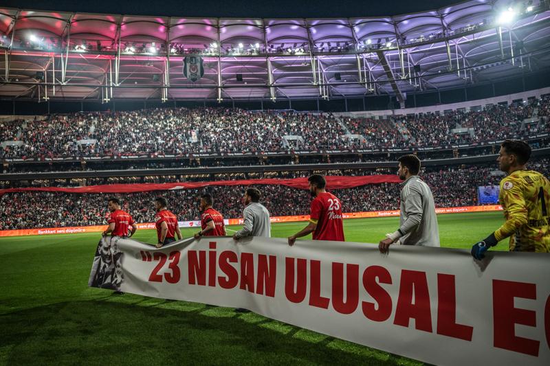 Öte yandan iki takım oyuncuları ve hakem kadrosu sahaya "23 Nisan Ulusal Egemenlik ve Çocuk Bayramımız kutlu olsun" pankartıyla çıktı.