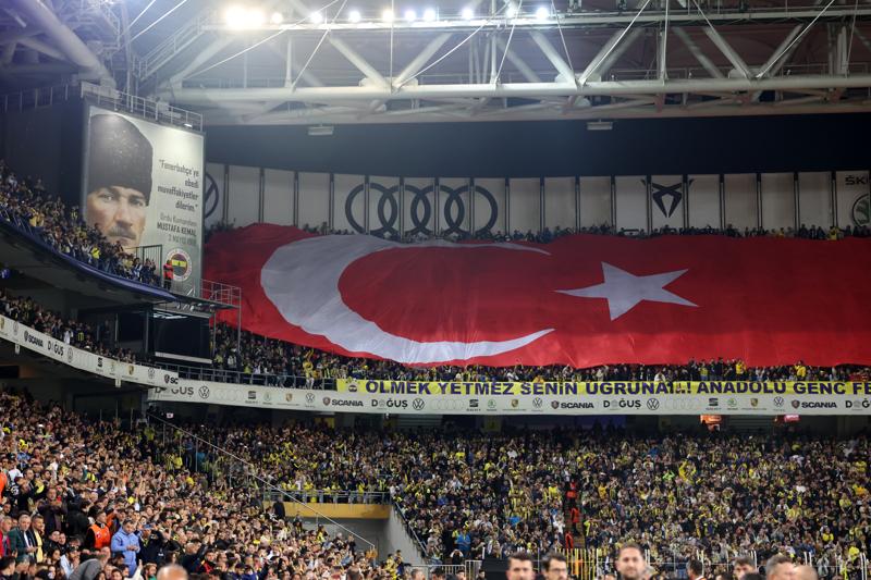 Tribünleri dolduran sarı-lacivertli taraftarlar, tribünlerde dev Türk bayrakları açarken, koreografide Mustafa Kemal Atatürk'ün tribünün tamamını kaplayan posterine yer verdi.