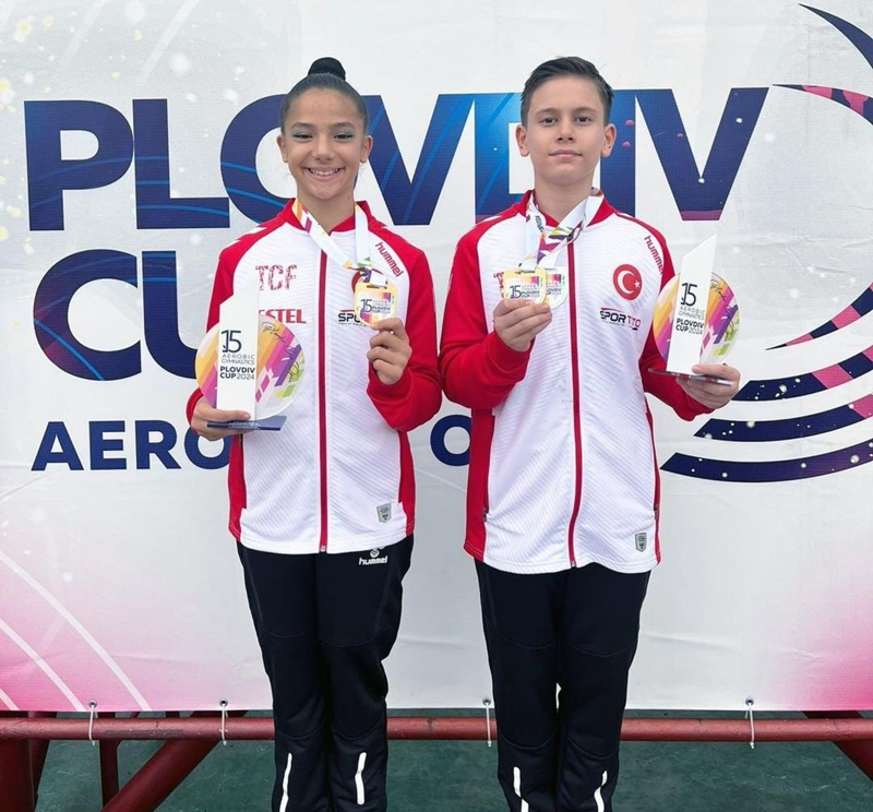 Manisalı cimnastikçiler Furkan Saylan ve Duru Günen Bulgaristan'ın Plovdiv kentinde düzenlenen Aerobik Cimnastik Uluslararası Plovdiv Cup Yarışmasında 12-14 yaş çiftler kategorisinde altın madalya kazandı.
