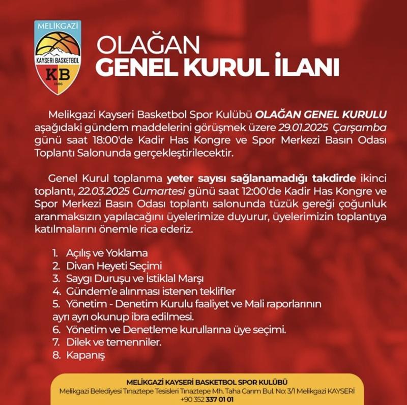ING Kadınlar Basketbol Süper Ligi takımlarından Melikgazi Kayseri Basketbol Kulübü Olağan Genel Kurul yapacak. Melikgazi Kayseri Basketbol Kulübünden yapılan açıklamada, "Melikgazi Kayseri Basketbol Spor Kulübü Olağan Genel Kurulu birinci toplantı 29 Ocak 2025 Çarşamba Saat 18.00'de Kadir Has Kongre ve Spor Salonunda, çoğunluk sağlanamazsa ikinci toplantı tüzük gereği 22 Mart 2025 Cumartesi saat 12.00'de gerçekleşecek" denildi. Olağan Genel Kurul'da tüzük değişikliği ile yönetim ve denetim kurulunun faaliyet ve mali raporları okunup ibra edilecek.